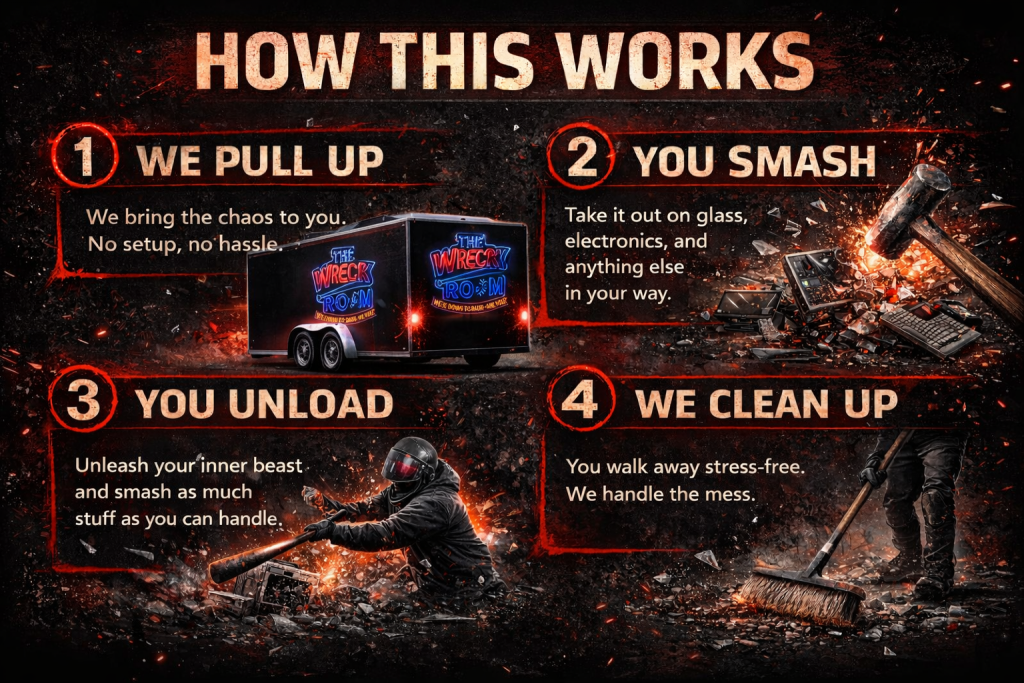 Welcome to The Wreck Room, where smashing stuff is not only encouraged — it’s mandatory. Life’s stressful, deadlines suck, and sometimes you just want to break things and smash shit without getting arrested. That’s exactly why we built this badass mobile rage room: to let you unleash your inner demolition expert with zero judgment and all the fun. Whether it’s a wild party, a brutal breakup, or just a Thursday that feels like a kick in the balls- this is your playground for pure destruction. So if you’ve ever wanted to take a sledgehammer to your boss’s face but can’t legally do it, The Wreck Room is your new best friend.